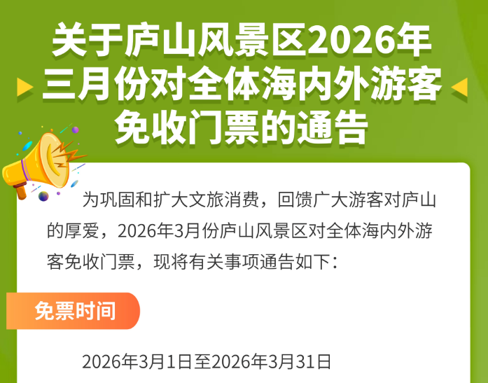 “中国庐山发布”微信公众号2月25日发布《关于庐山风景区2026年三月份对全体海内外游客免收门票的通告》。
