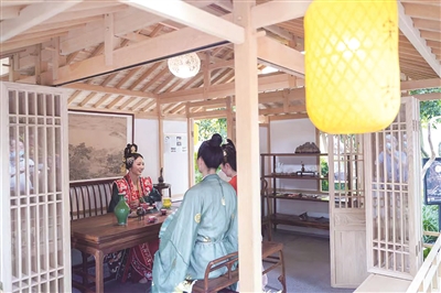 “宋代的建筑构造与造型技术达到了很高的水平。”资深建筑师、造园师乔子龙在现场搭建了一座宋屋。坐在屋内,打开折叠门窗,有种“清风明月来”的意韵,与内部的宋风家具相得益彰。