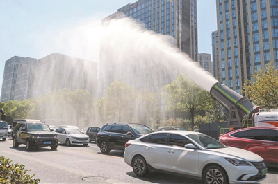 昨天艮山西路,雾炮车正在为道路、植物降温。 记者 夏阳 摄