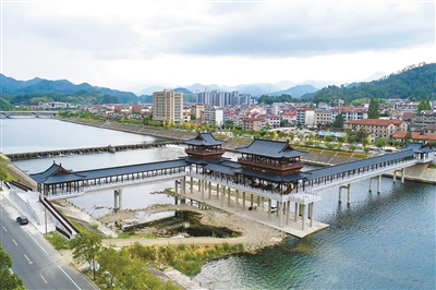近日,位于临安昌化溪上的东坡廊桥建设进入收尾阶段。东坡廊桥位于昌化镇,横跨昌化溪,桥体呈“Z”字形结构,以宋代建筑风格为主基调,古朴壮观。建设廊桥既是为方便百姓的日常通行和休闲观景,也是为纪念“大文豪”苏东坡——据悉,苏东坡在昌化镇的相关历史故事、所作的诗词等元素都将植入到廊桥中。