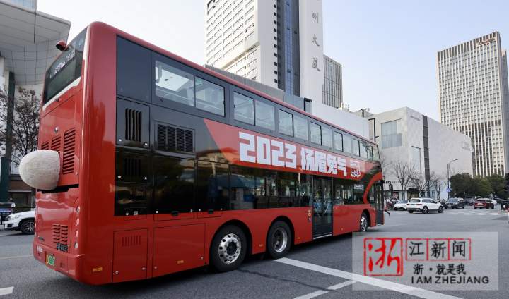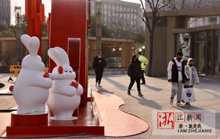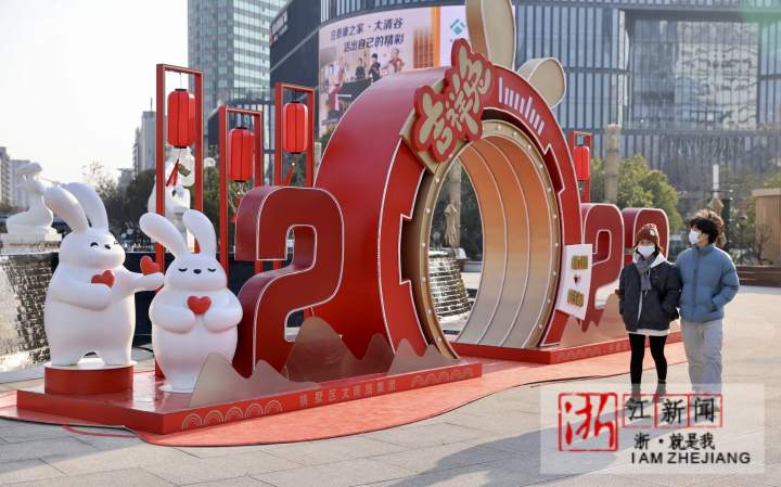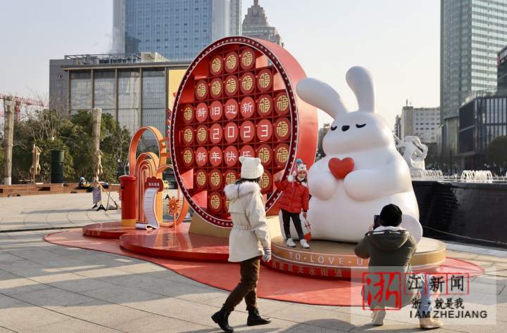 1月16日,杭州街头装上许多兔年的元素。武林广场八少女喷泉旁边,市民在白兔造型新年装置前拍照打卡。一辆绘有兔子元素的公交车上,“2023扬眉兔气”字样十分醒目。