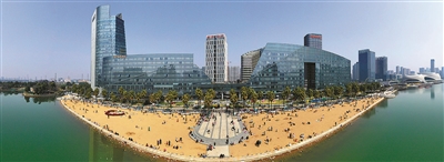 金沙湖是位于钱塘区下沙板块核心区的一个人工湖,公园总面积约64.7万平方米,水域面积约31万平方米,集生态、文化、休闲于一体。金沙湖公园从2010年5月开工建设,共分四期;目前,四期工程已基本完工并拆除了大部分施工围挡,面向公众整体试开放。公园湖畔的标志性建筑——金沙湖大剧院也将在今年杭州亚运会前启用。记者 李忠 摄