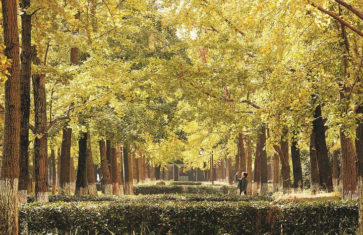 昨日,市民游客在拱墅区上塘路大关段的银杏林游玩,近期这片银杏林在寒风中黄染枝头,渐入最佳观赏期。当日杭城正式入冬,受寒潮影响,最低气温仅为4.5℃,比历年平均入冬时间提前了10多天。